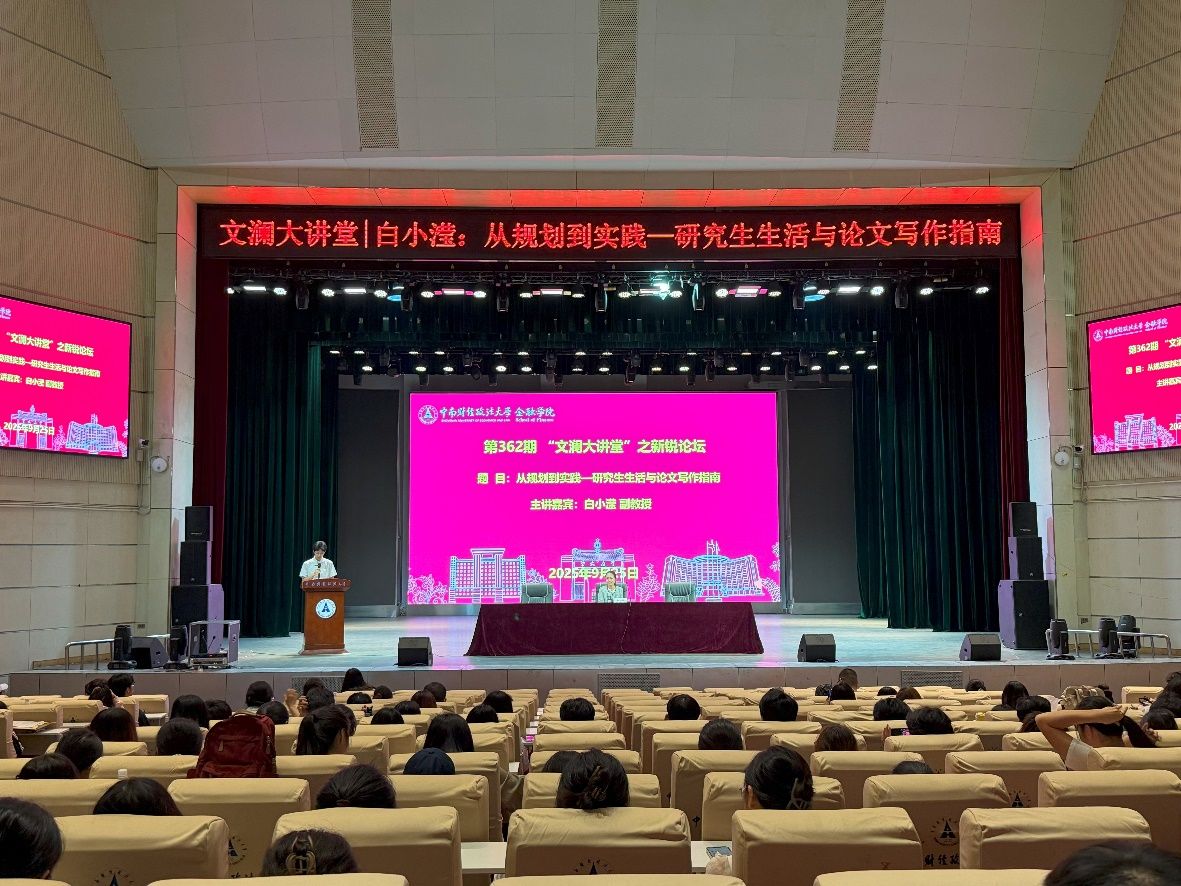 (通讯员:汪子昂 李玥)9月25日14:00,由校研究生院、党委研究生工作部、研究生会、研究生学术创新中心主办,金融学院研究生会承办的第362期“文澜大讲堂”之新锐论坛:“从规划到实践——研究生生活与论文写作指南”专题讲座在南湖会堂圆满举行。本次讲座特邀中南财经政法大学金融学院白小滢副教授主讲。金融学院400余名硕博士研究生参与了此次讲座。